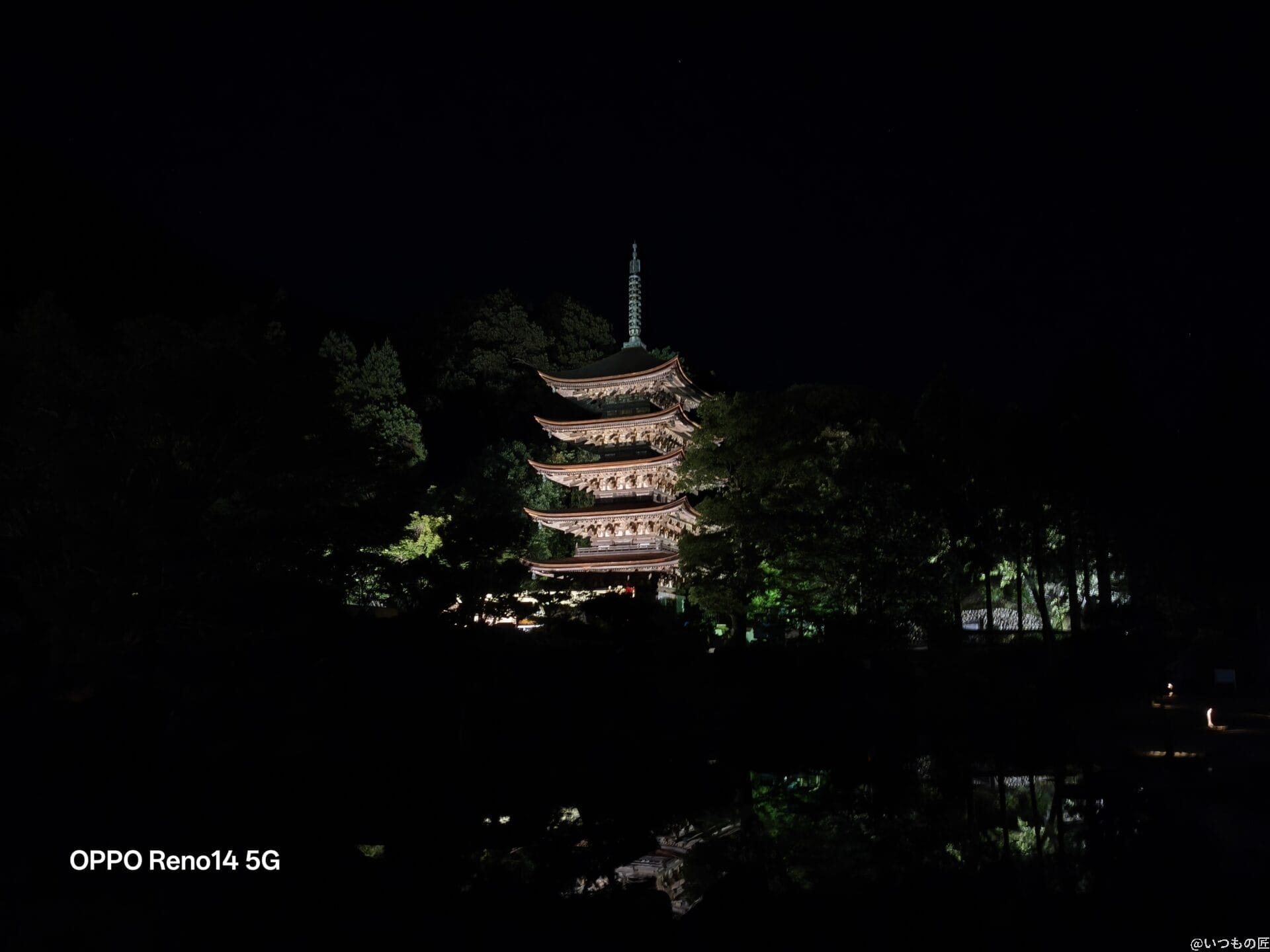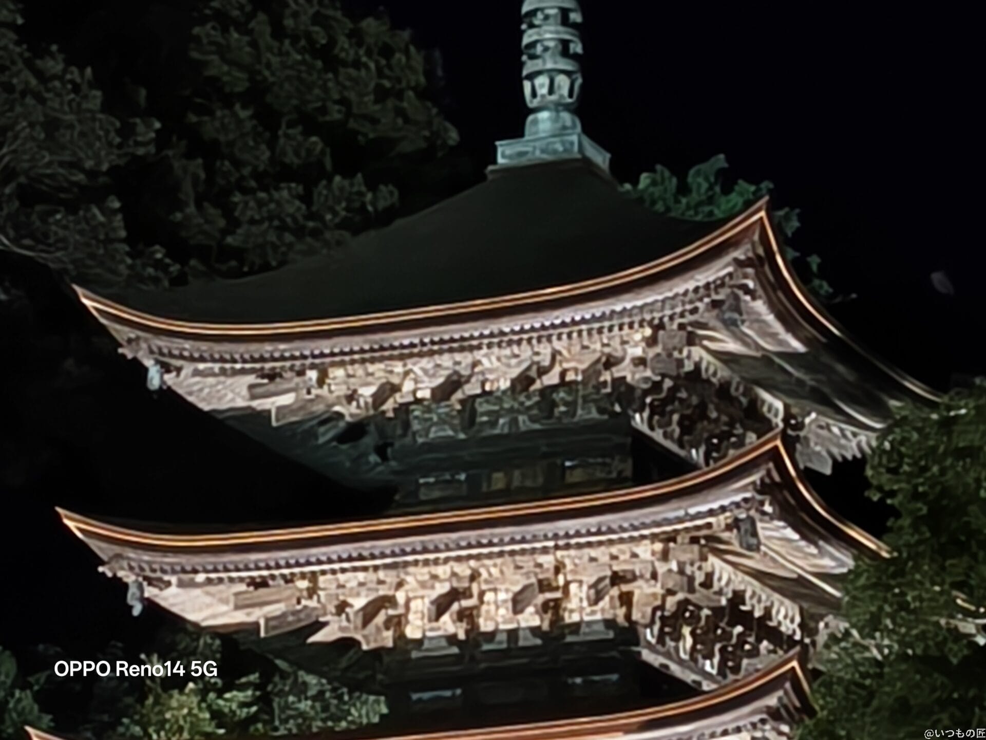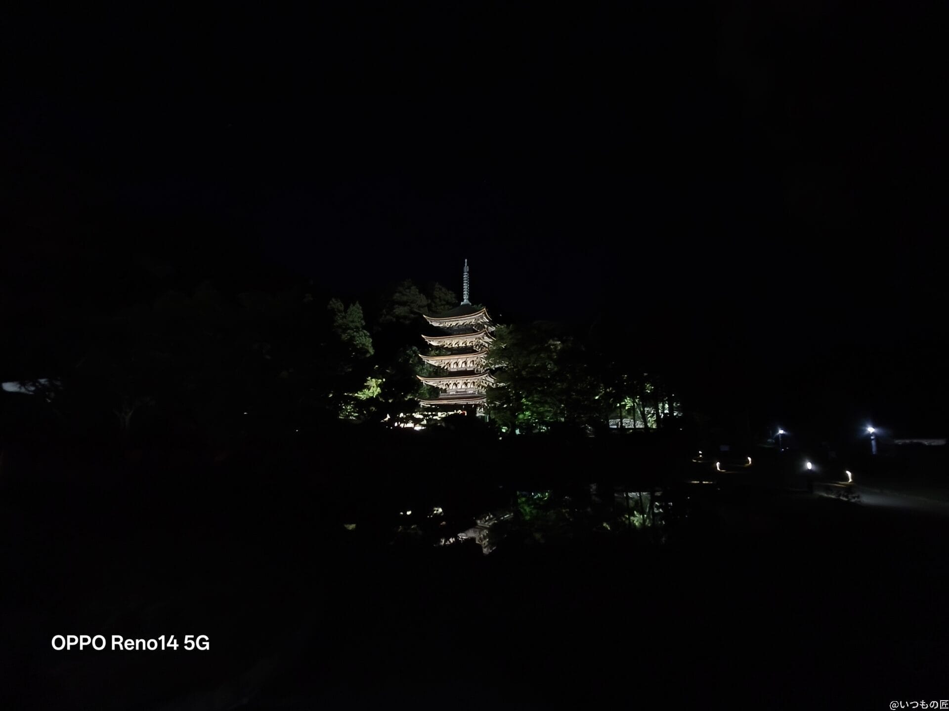 2倍ズームで撮影した写真を比べると、Reno14 5Gはライトアップの光を柔らかく表現しています。Pixel 9 Proは明るさに優れていますが、Reno14 5Gの方が夜空のノイズが少なく五重塔を鮮明に捉えています。