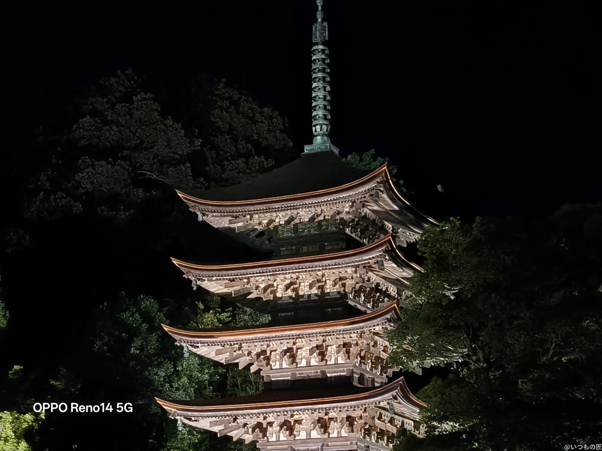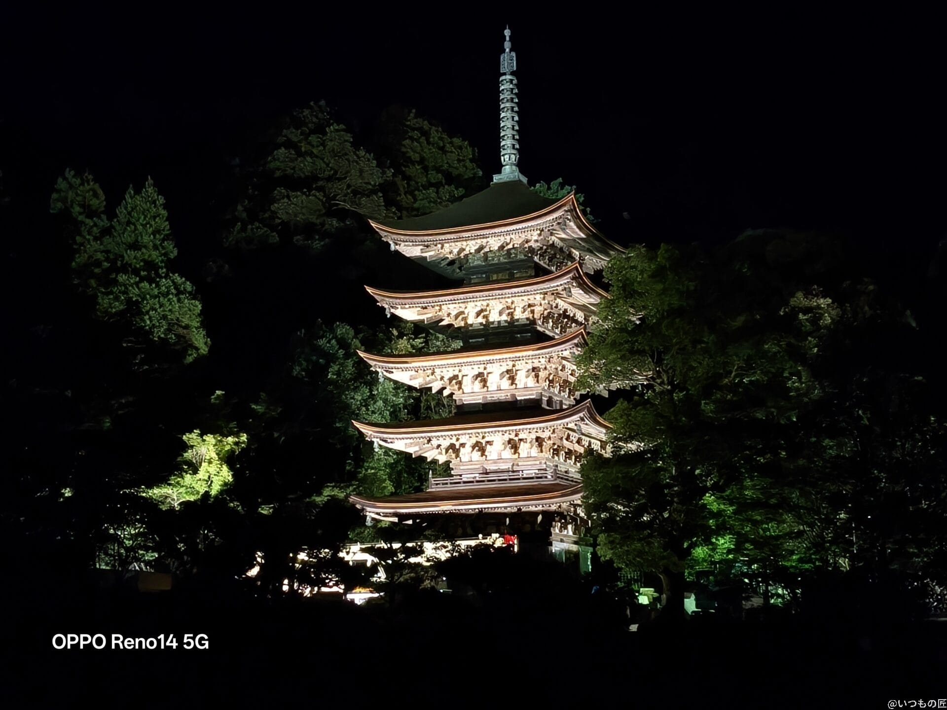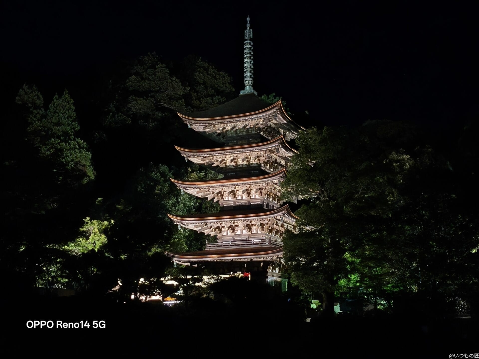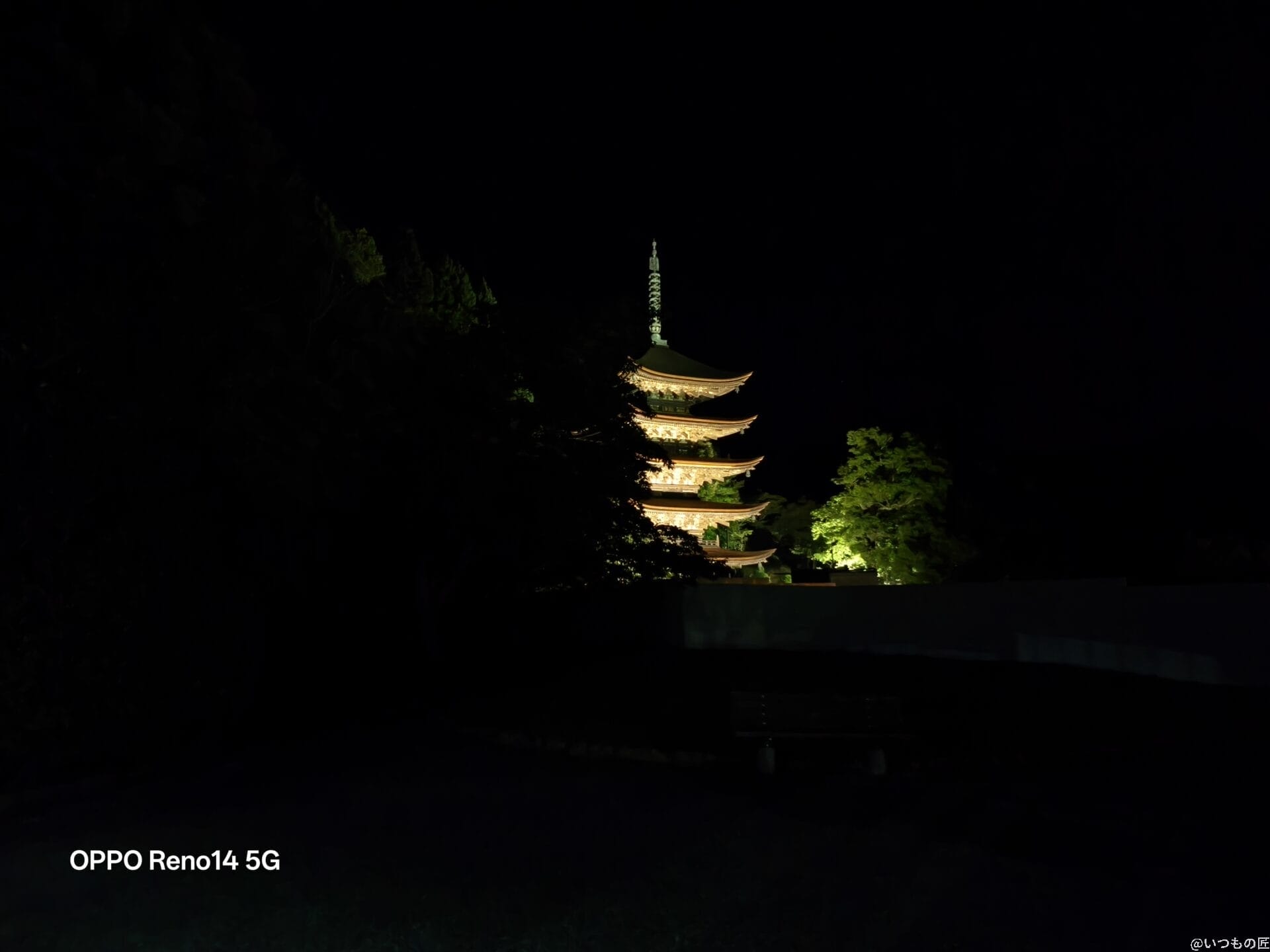 2倍ズームで撮影した写真を比べると、Reno14 5Gはライトアップの光を柔らかく表現しています。Pixel 9 Proは明るさに優れていますが、Reno14 5Gの方が夜空のノイズが少なく五重塔を鮮明に捉えています。