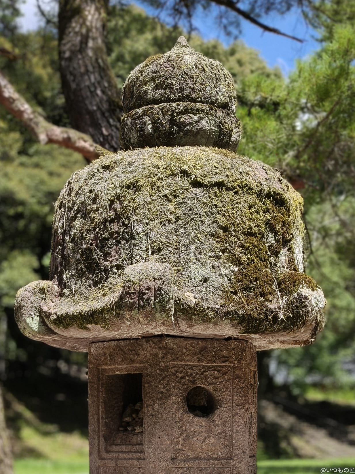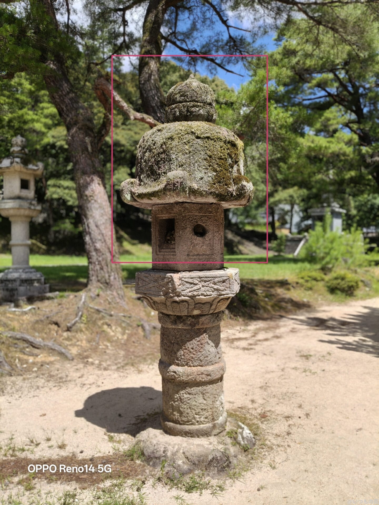 以下は、石の灯籠にピントを合わせて撮影した一枚です。背景を柔らかくぼかしつつ、被写体を際立たせています。灯篭の苔など細部まで、鮮明に描写できています。
